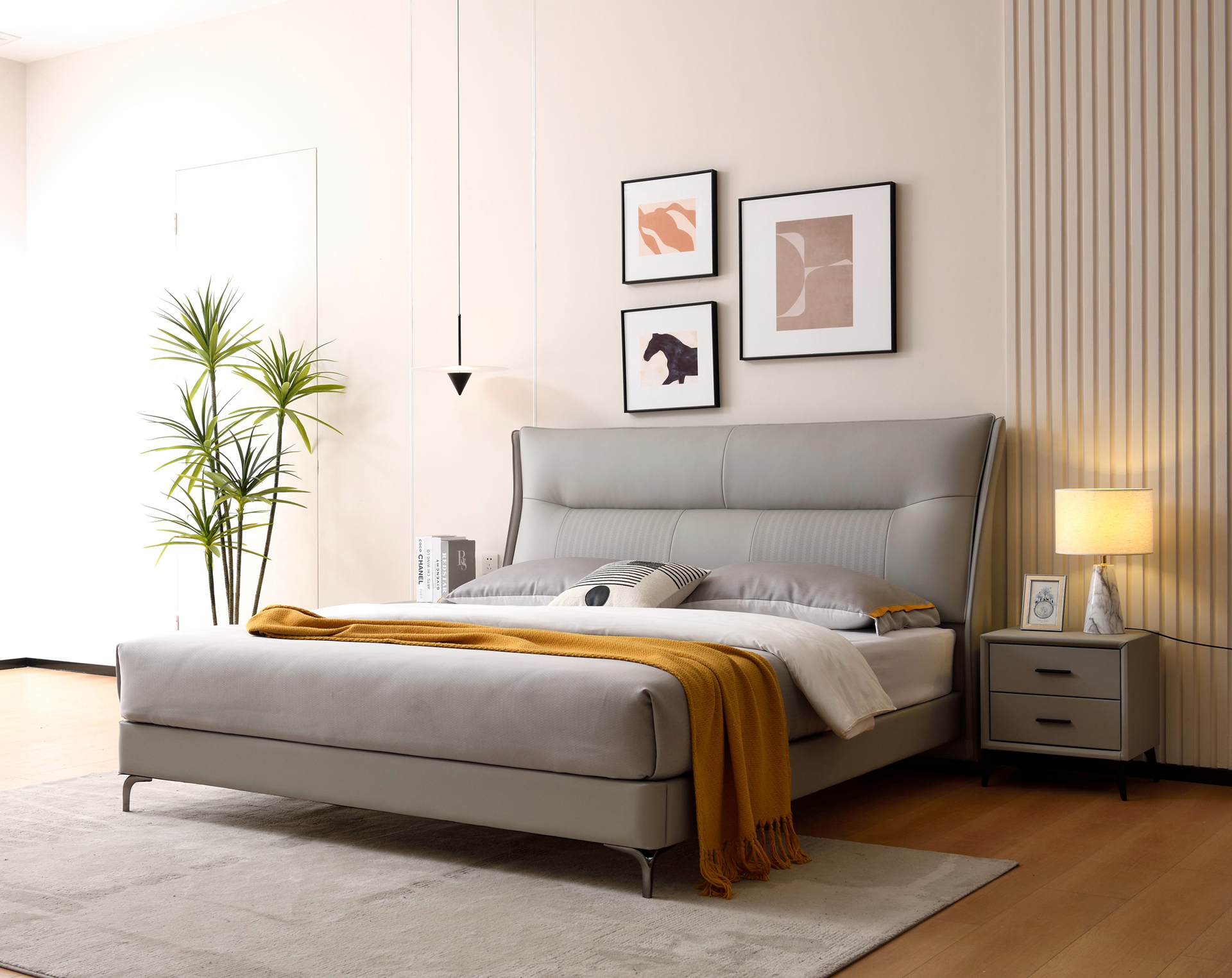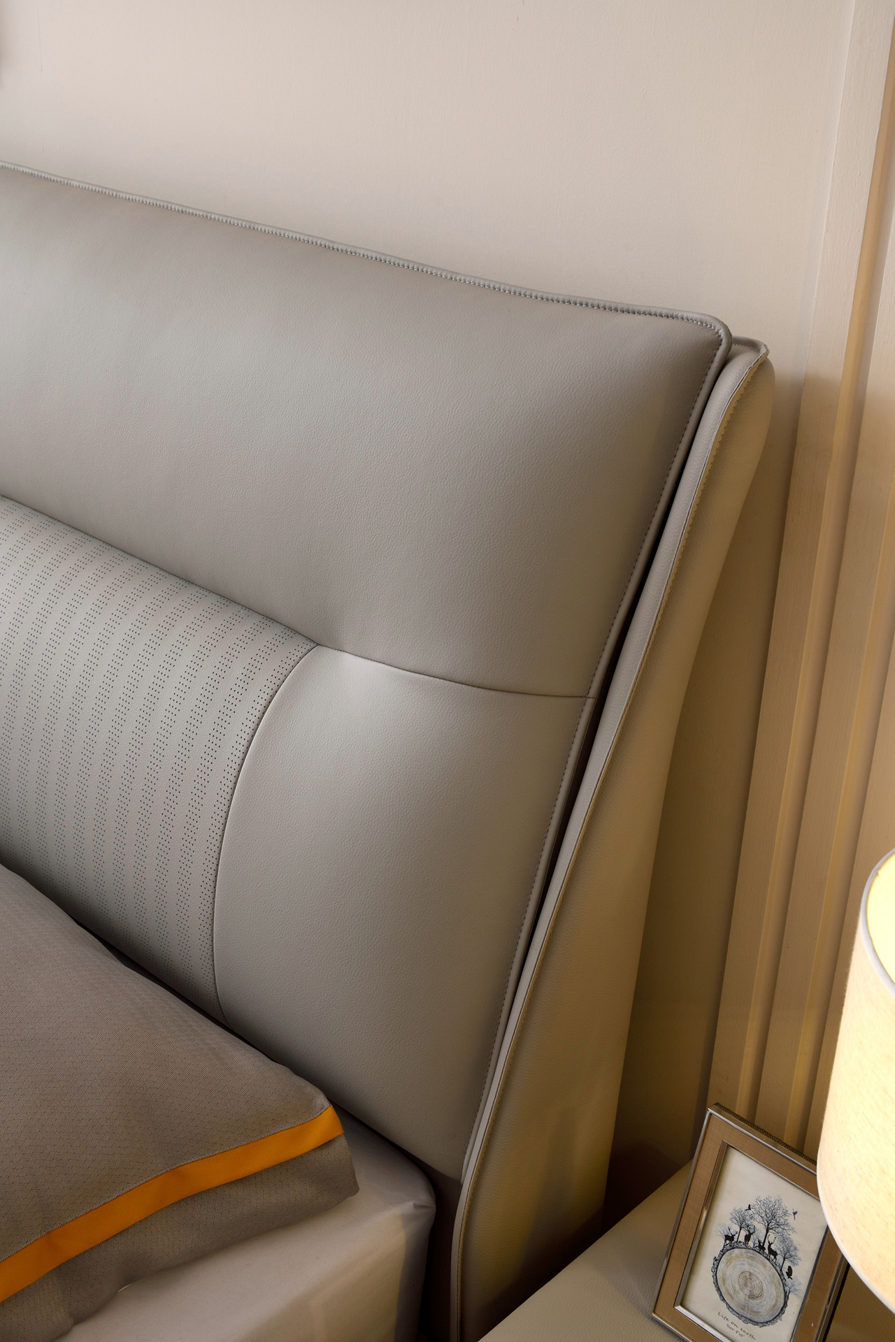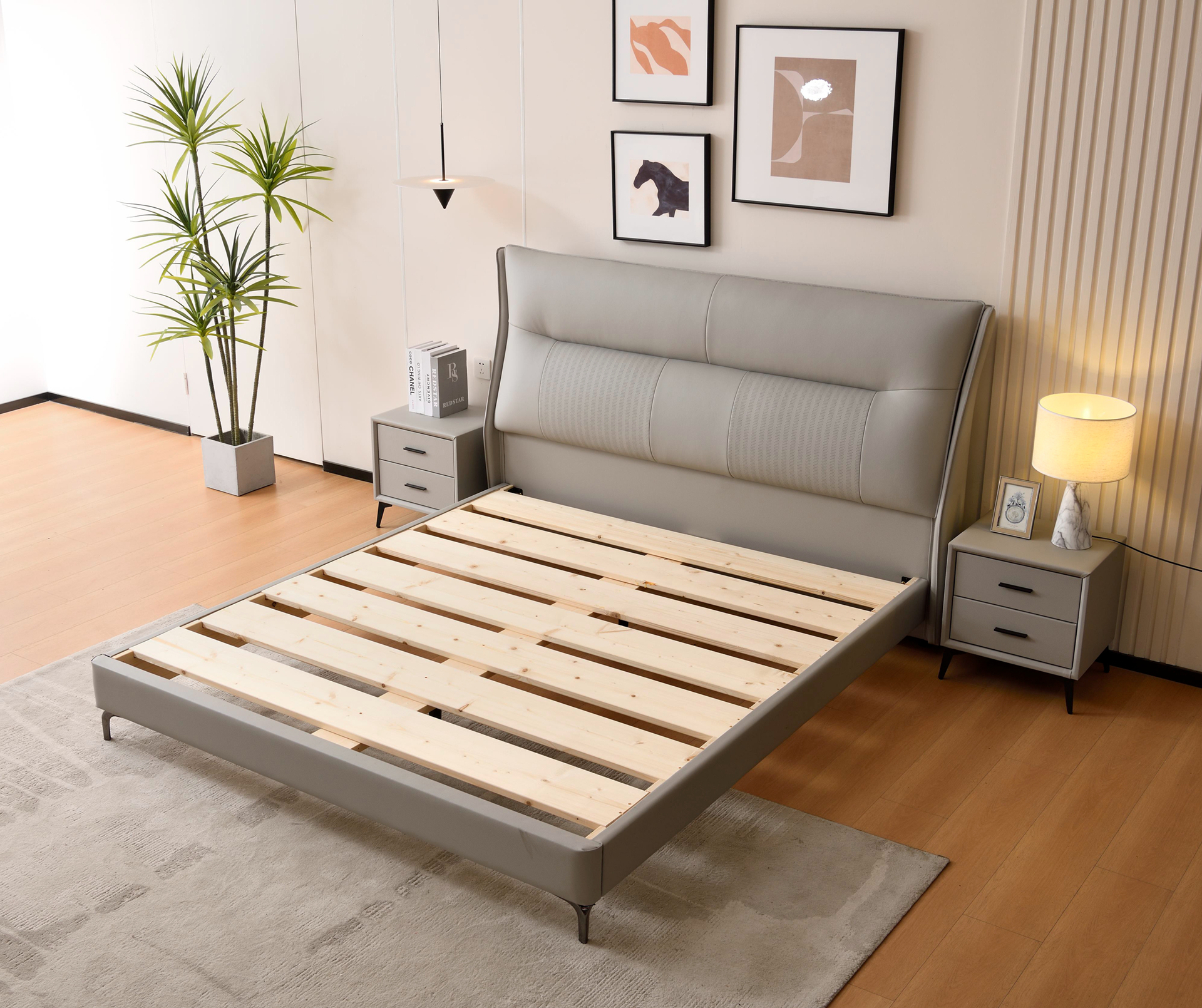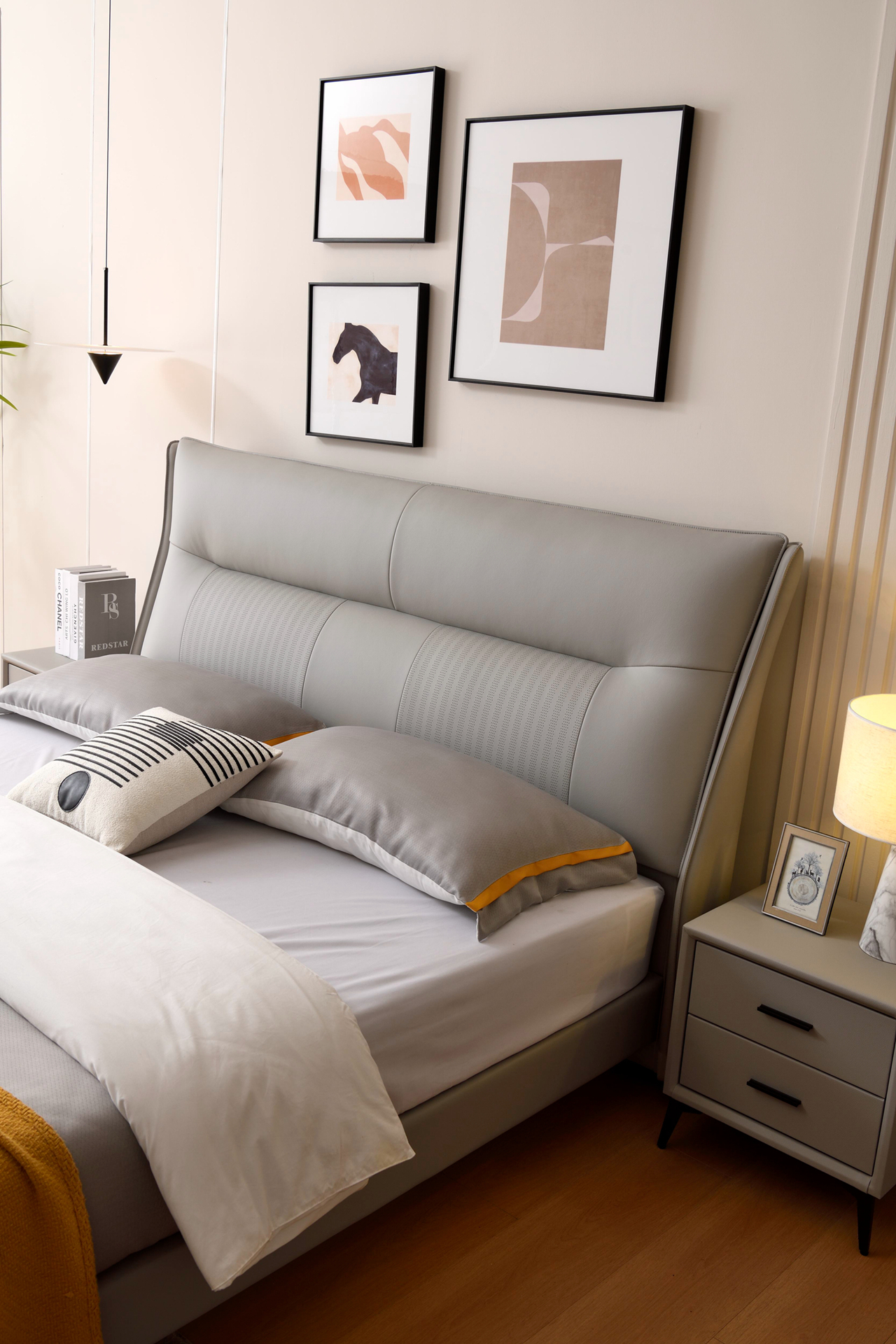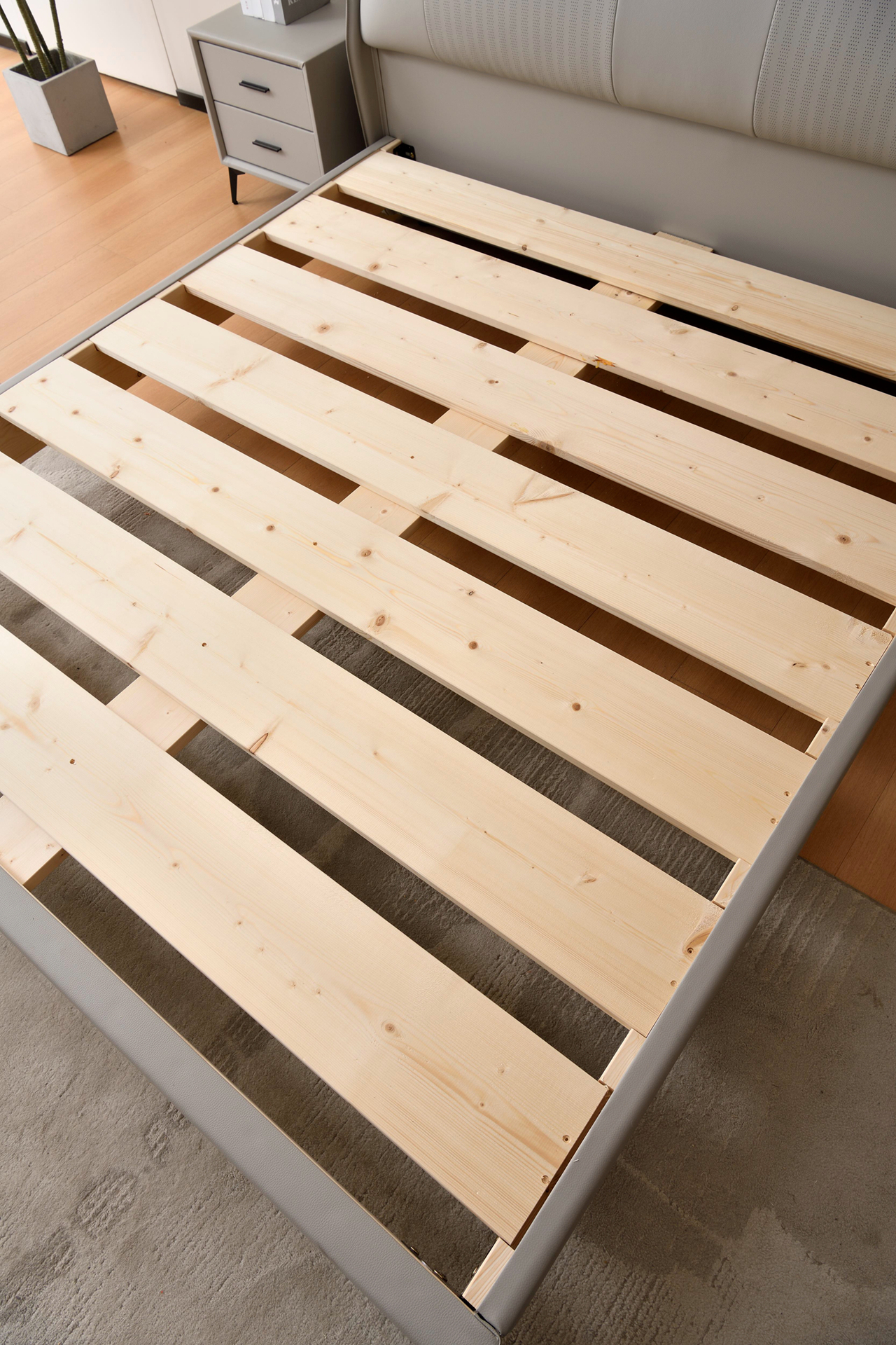 型号:A15颜色:银河灰材质:生态真皮 太阳纹 三防面料 防水 防刮 防污 冲孔设计透气配置:60*150松木床边 30*150mm松木龙骨 25*200mm松木床板 枪色钛金一体脚纸箱:K636C外围尺寸1.5M: 1680*2220*1200mm1.8M: 1980*2220*1200mm