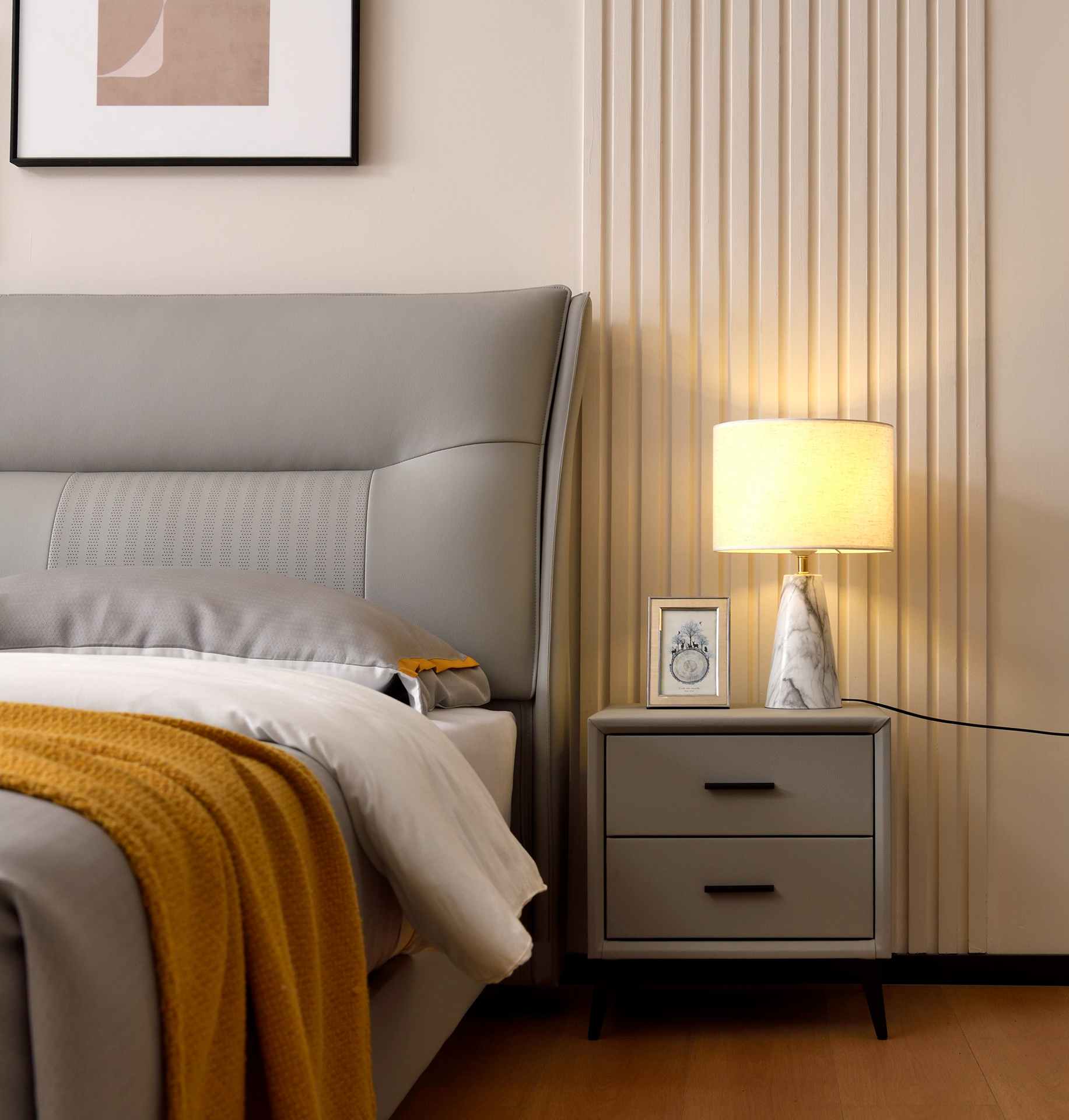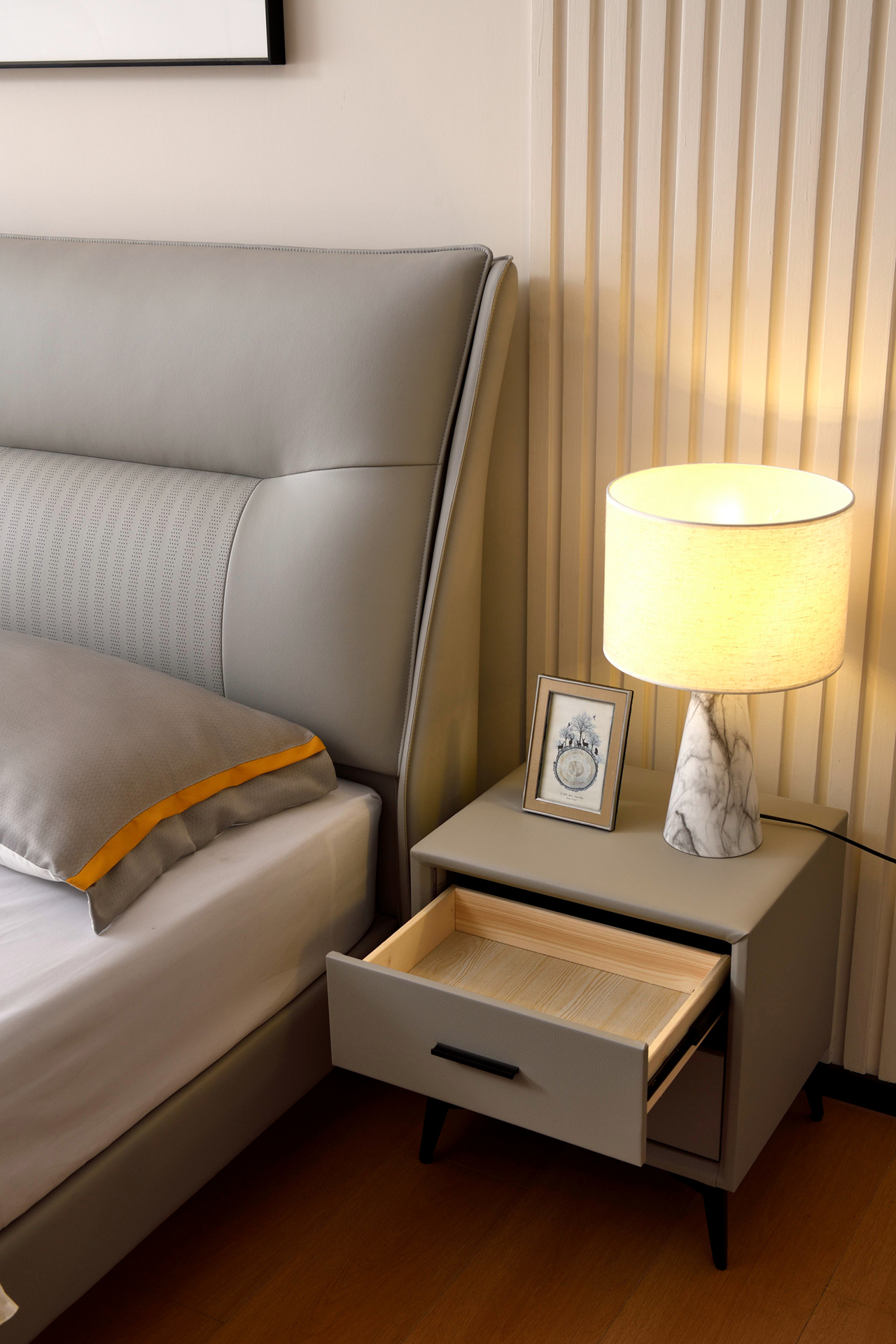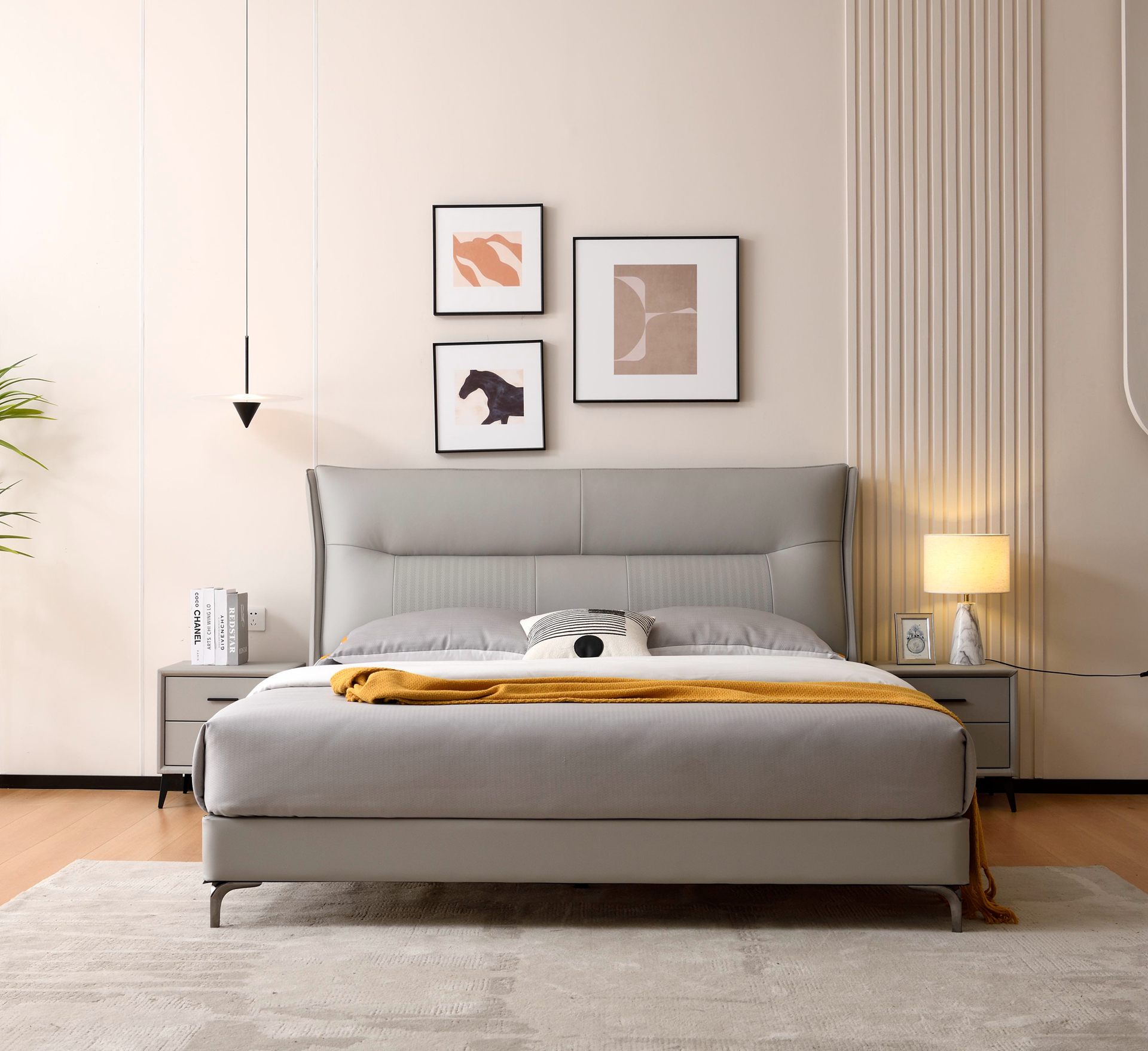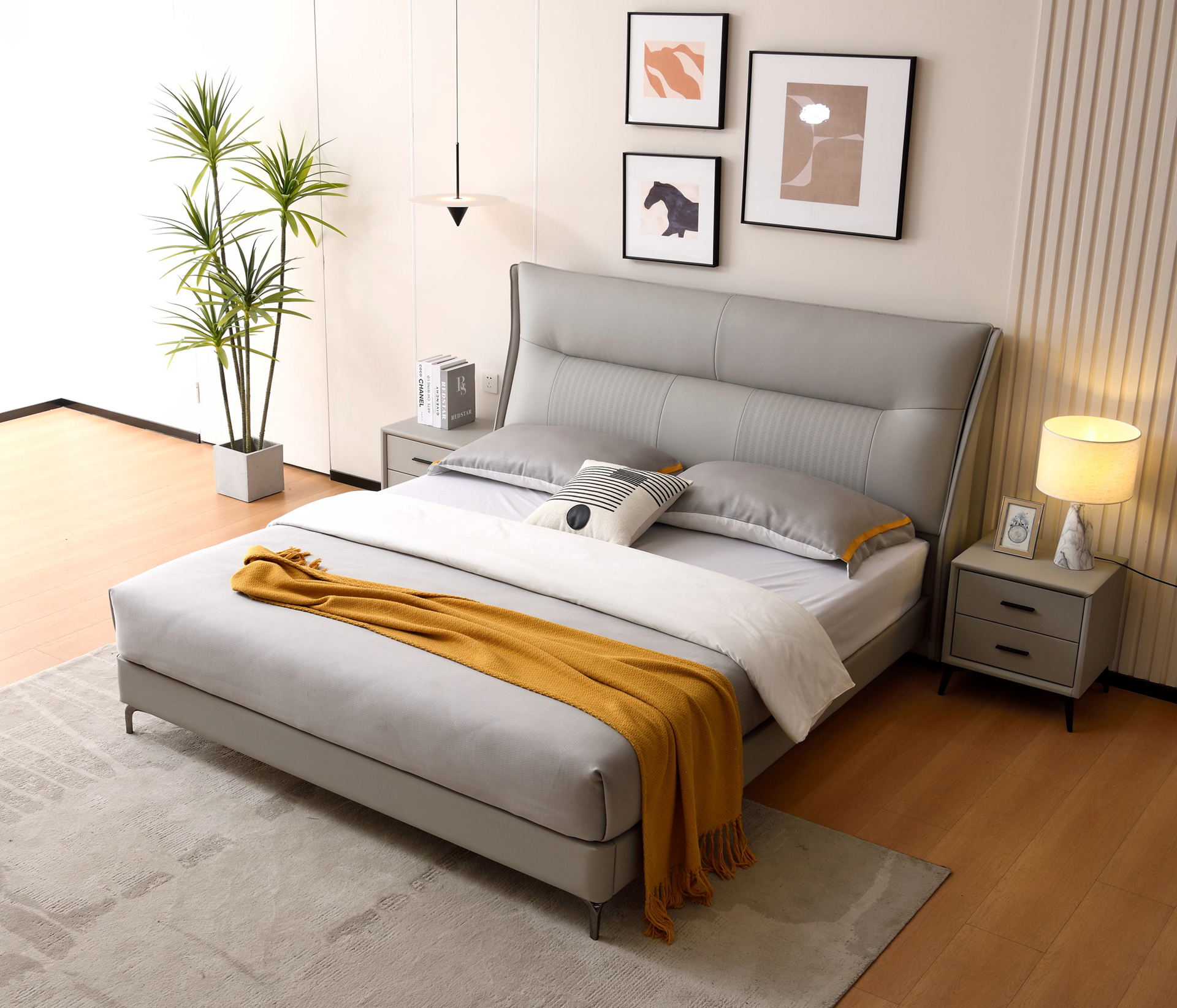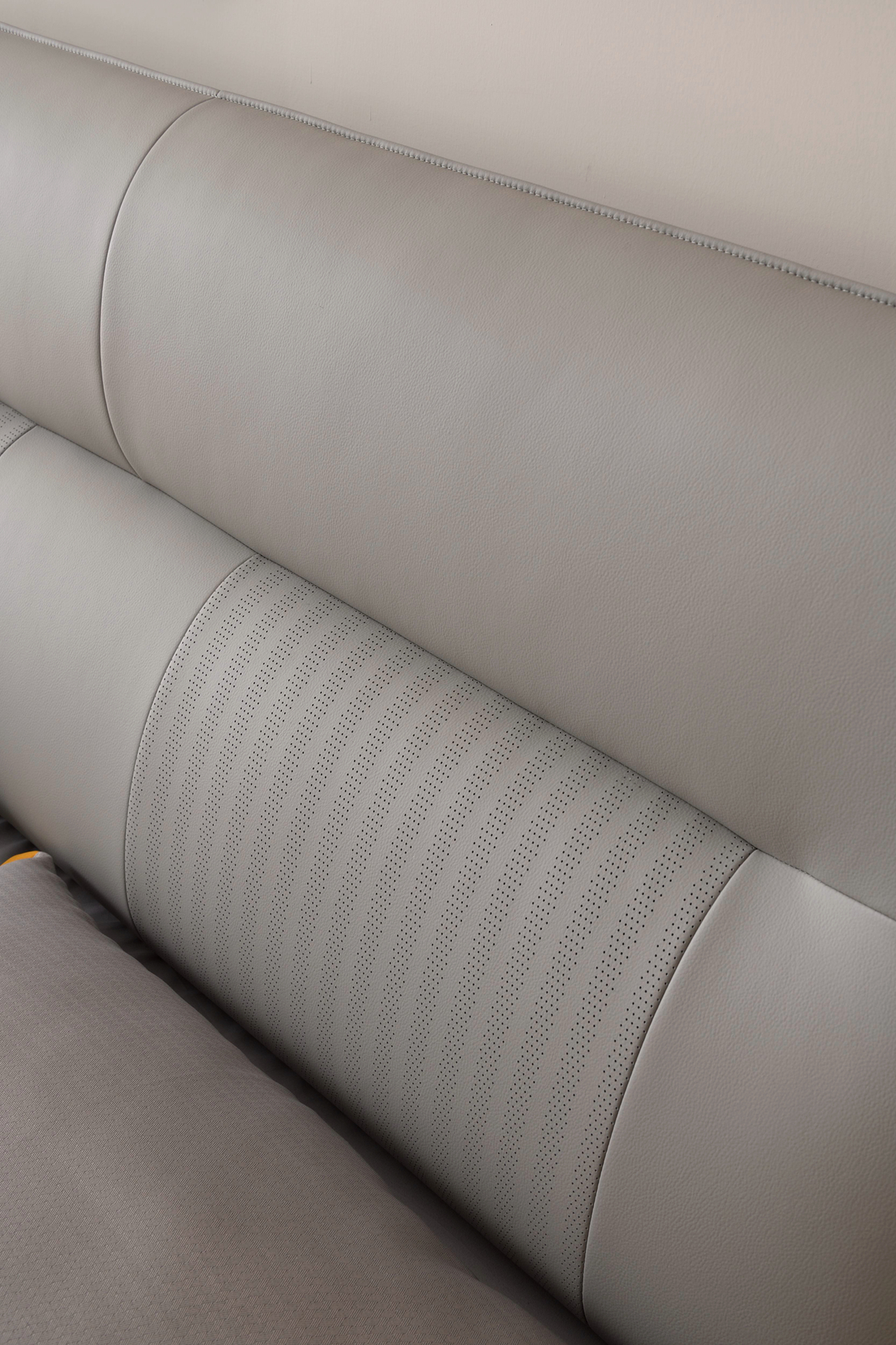 型号:A15颜色:银河灰材质:生态真皮 太阳纹 三防面料 防水 防刮 防污 冲孔设计透气配置:60*150松木床边 30*150mm松木龙骨 25*200mm松木床板 枪色钛金一体脚纸箱:K636C外围尺寸1.5M: 1680*2220*1200mm1.8M: 1980*2220*1200mm