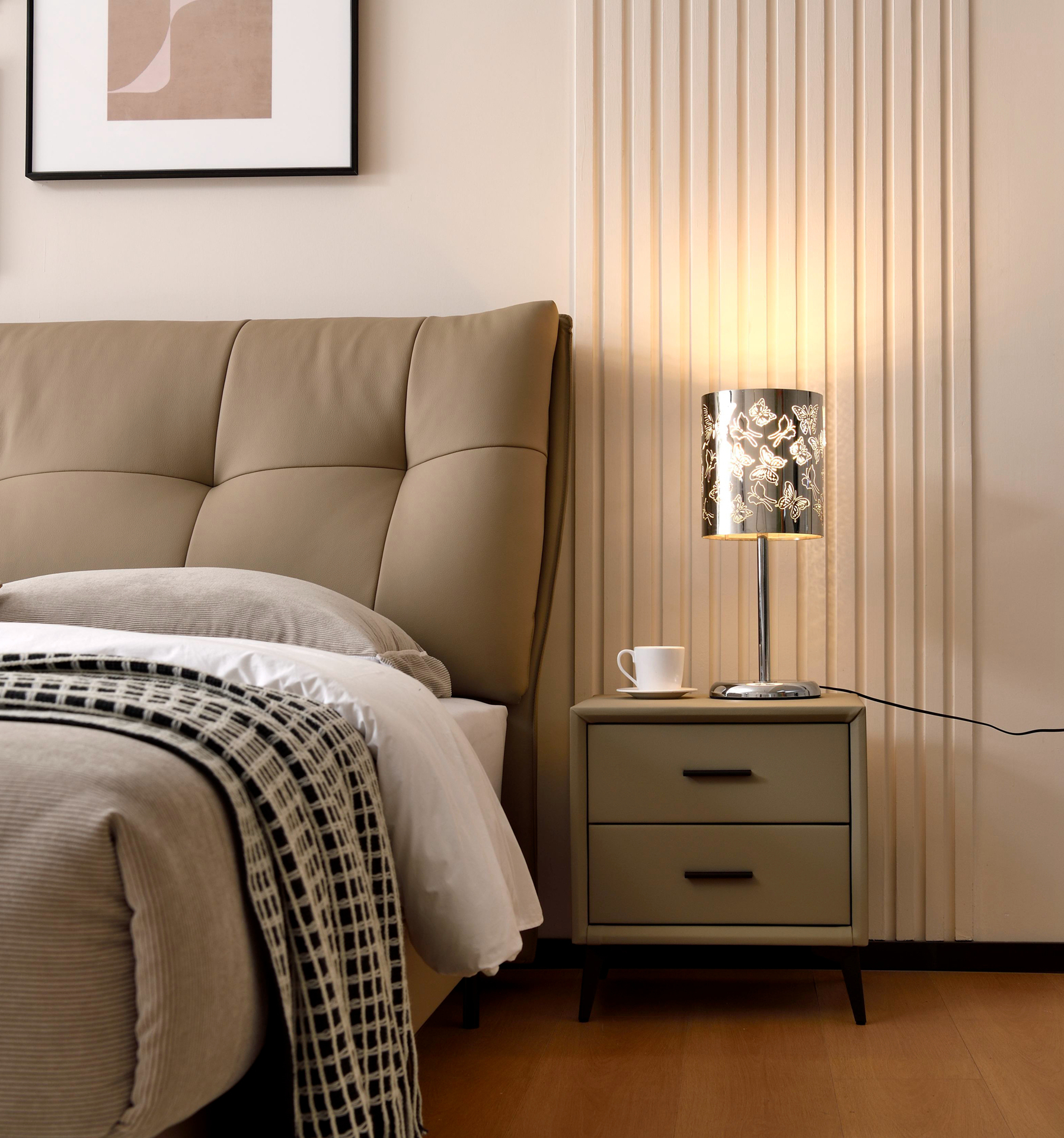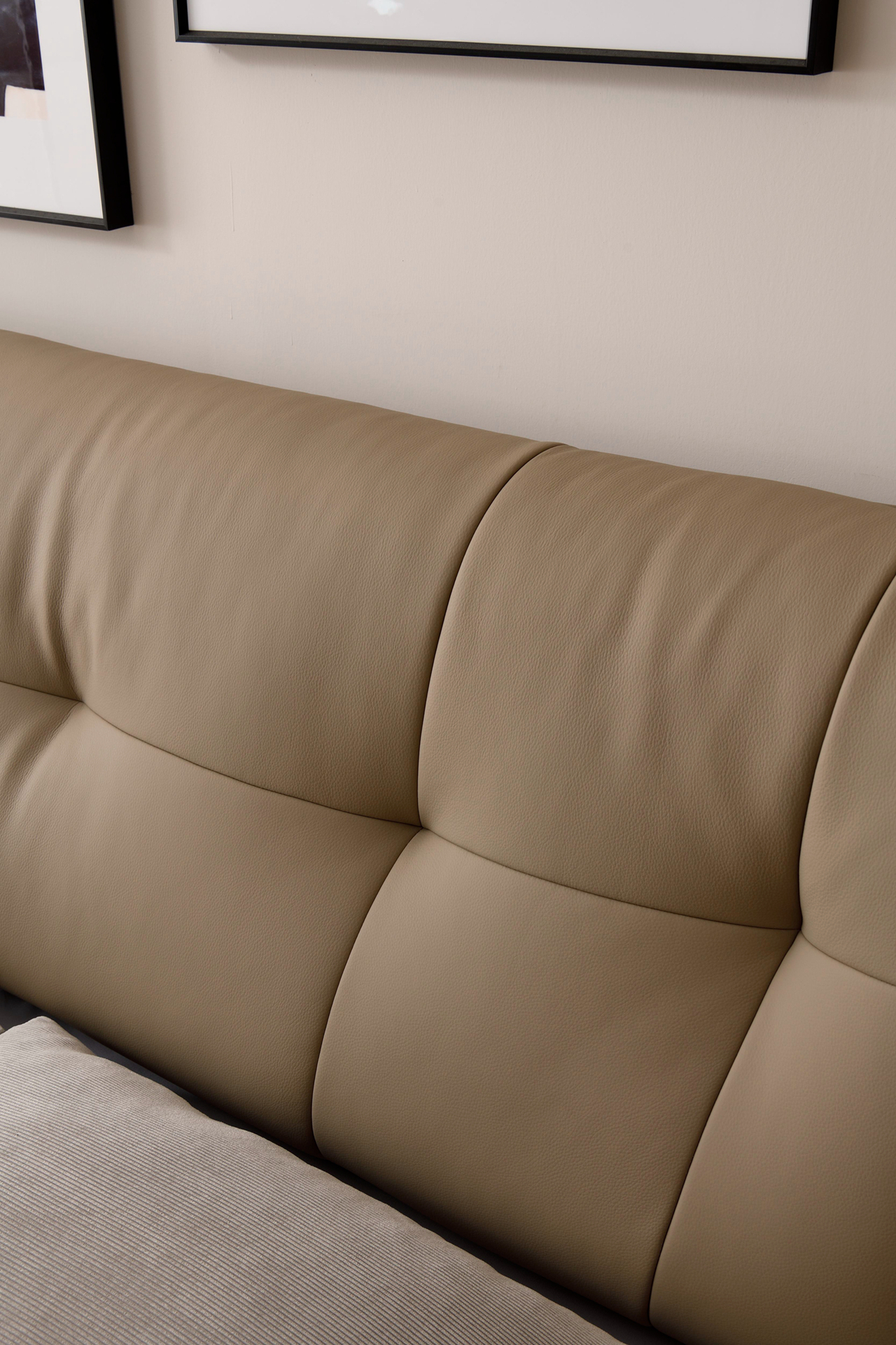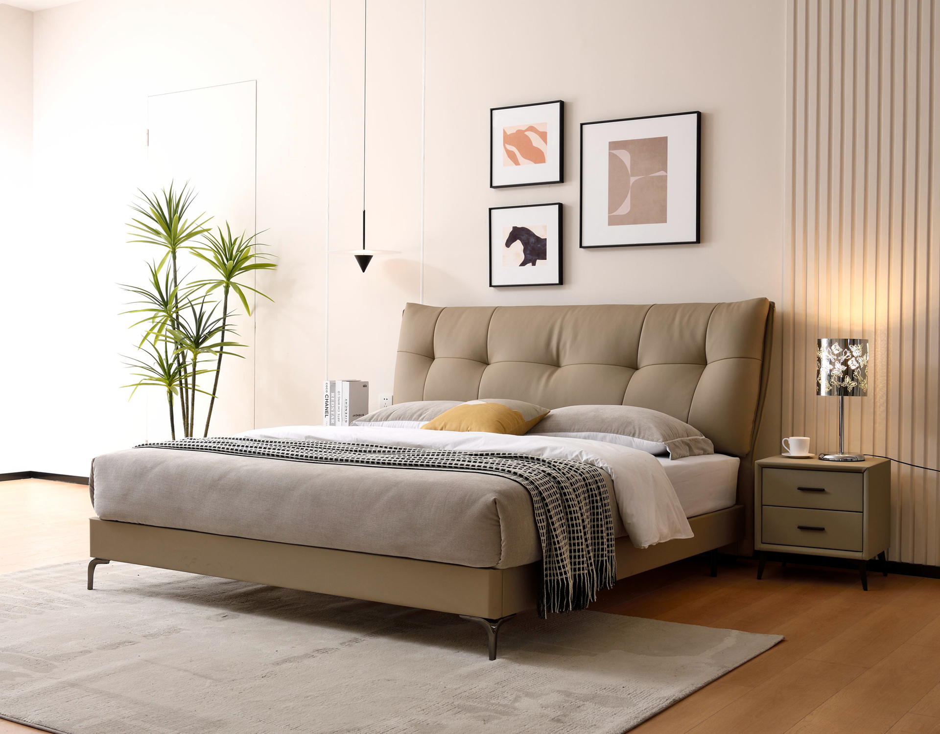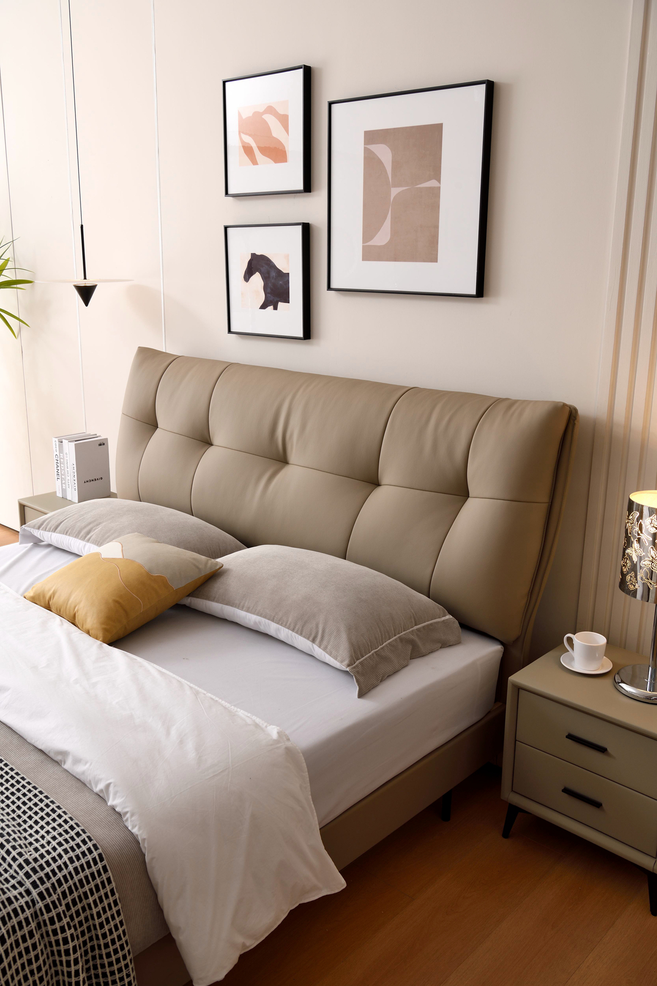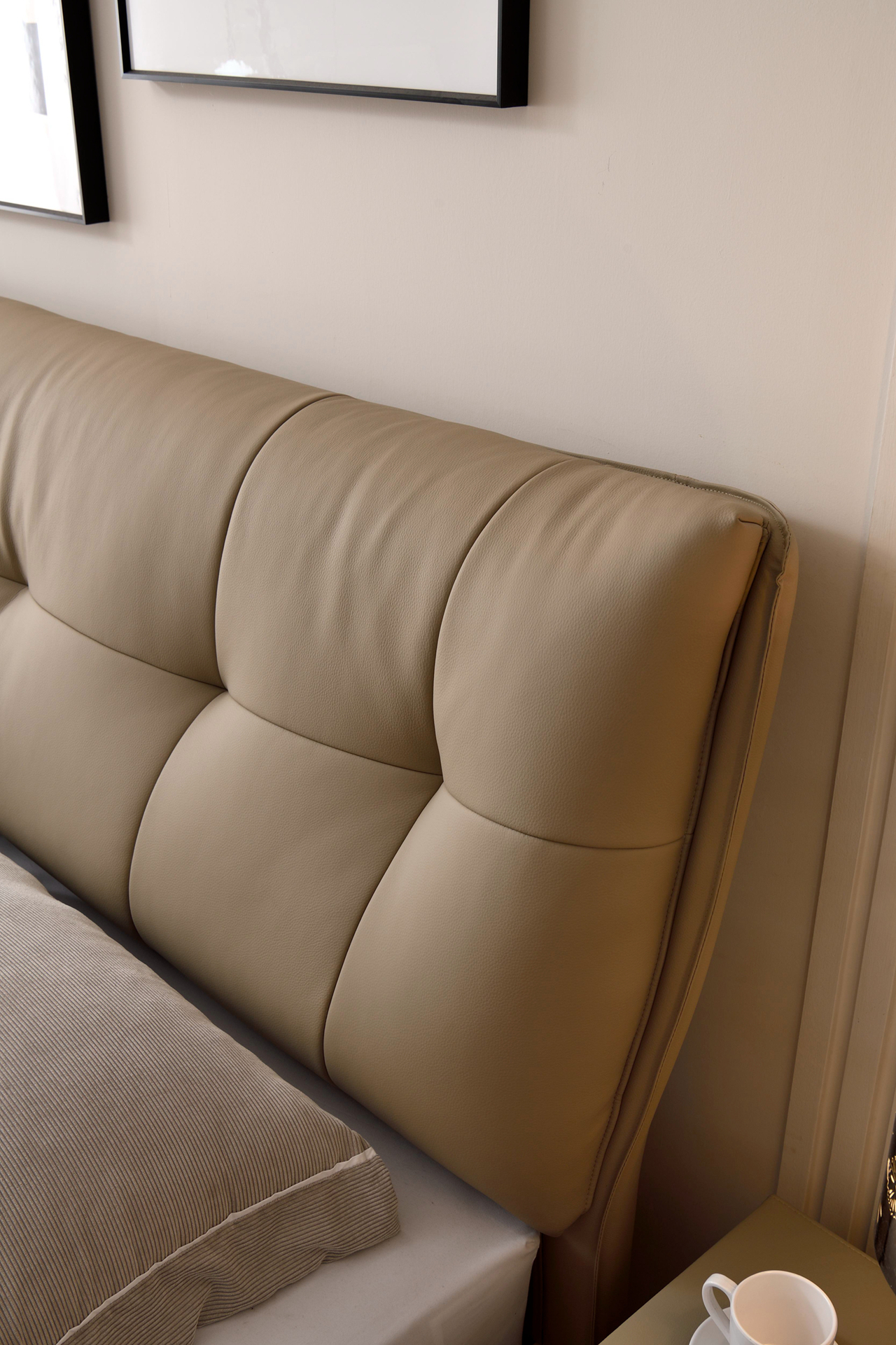 型号:A8819颜色:浅咖色材质:纳帕真皮 太阳纹 三防面料 防水 防刮 防污 超柔系列 羽绒充包配置:40*150mm 松木床边 40*90mm松木龙骨 30*150mm松木床板 枪色钛金脚纸箱:K636C外围尺寸1.5M: 1660*2230*1180mm1.8M: 1960*2230*1180mm