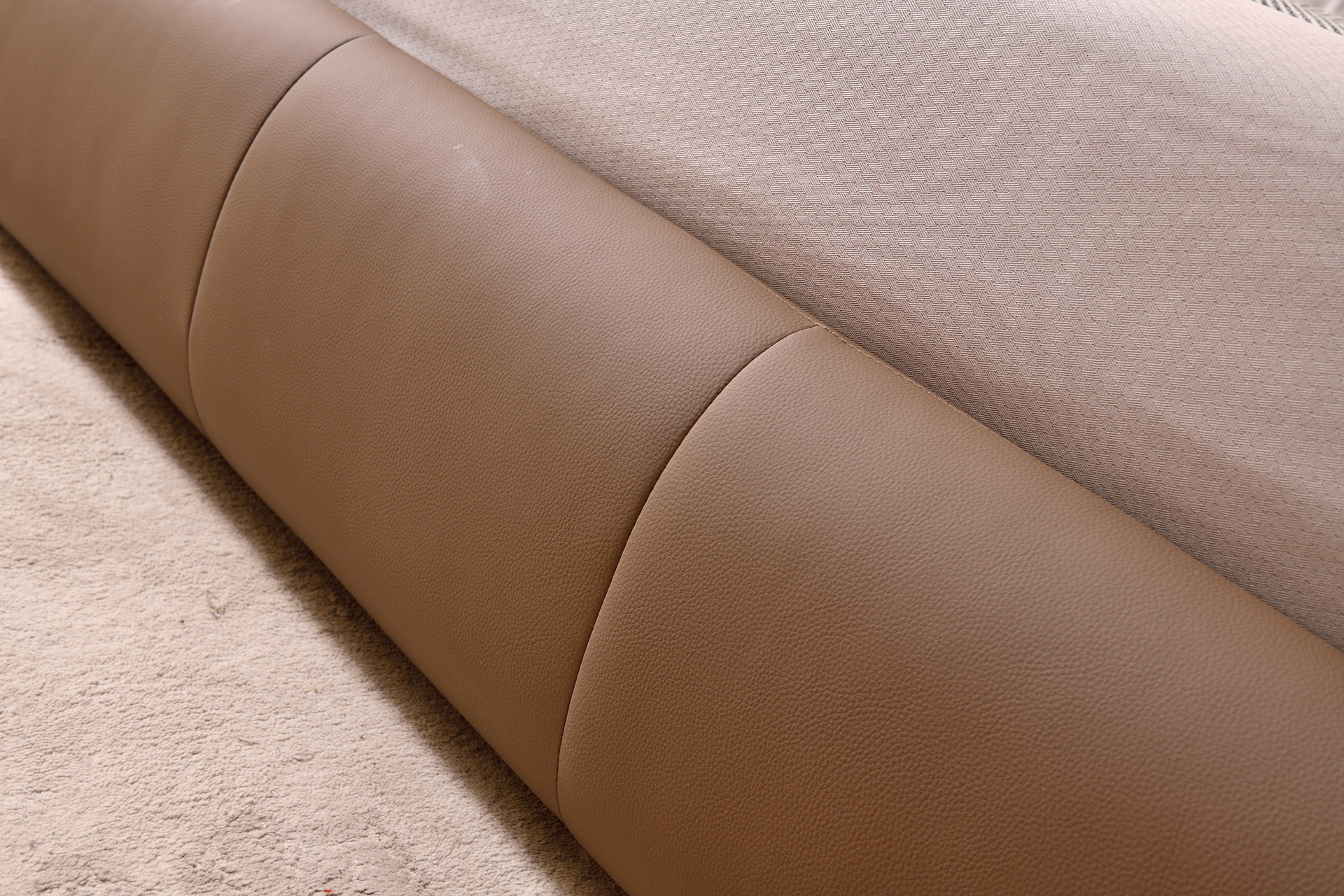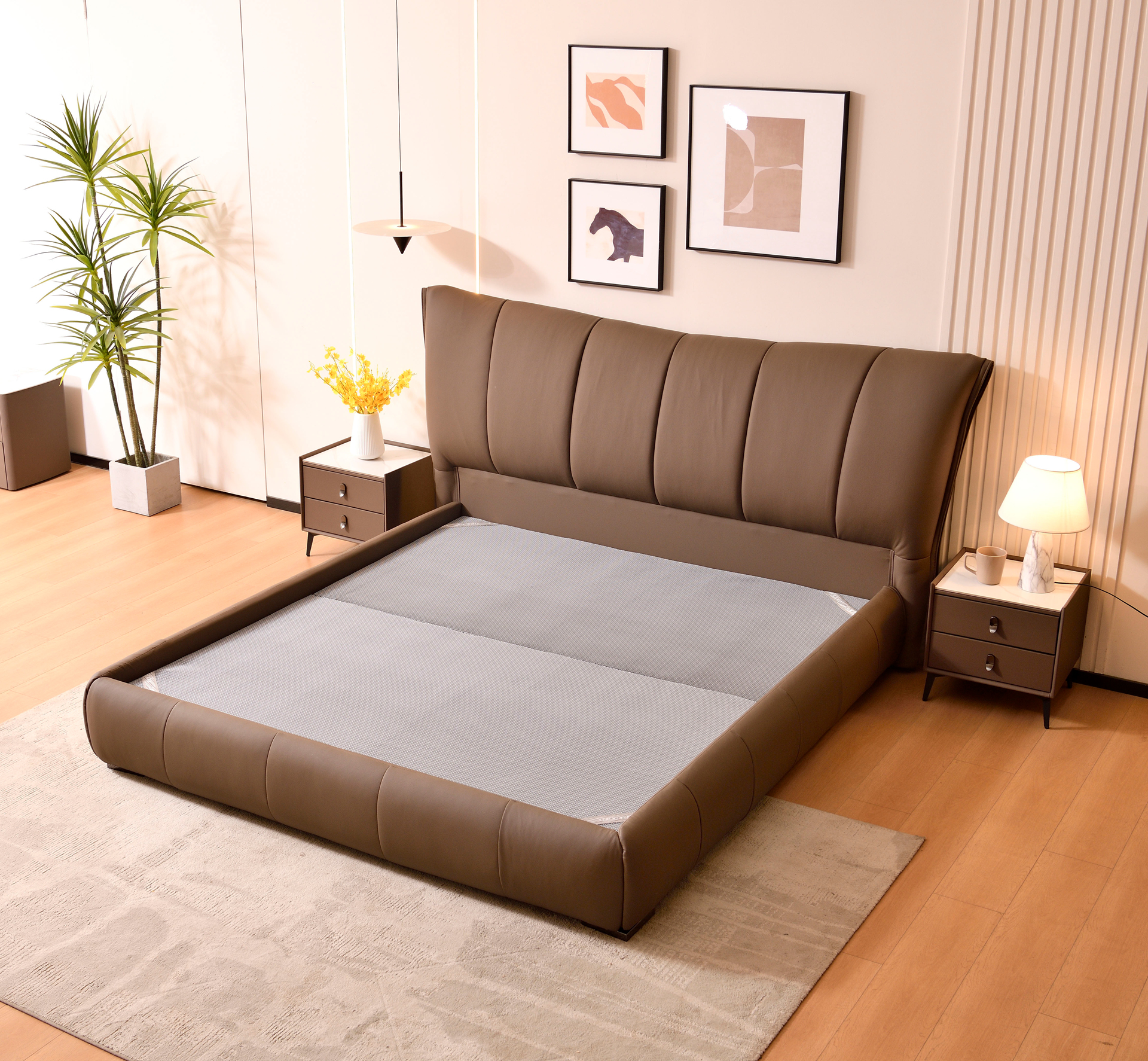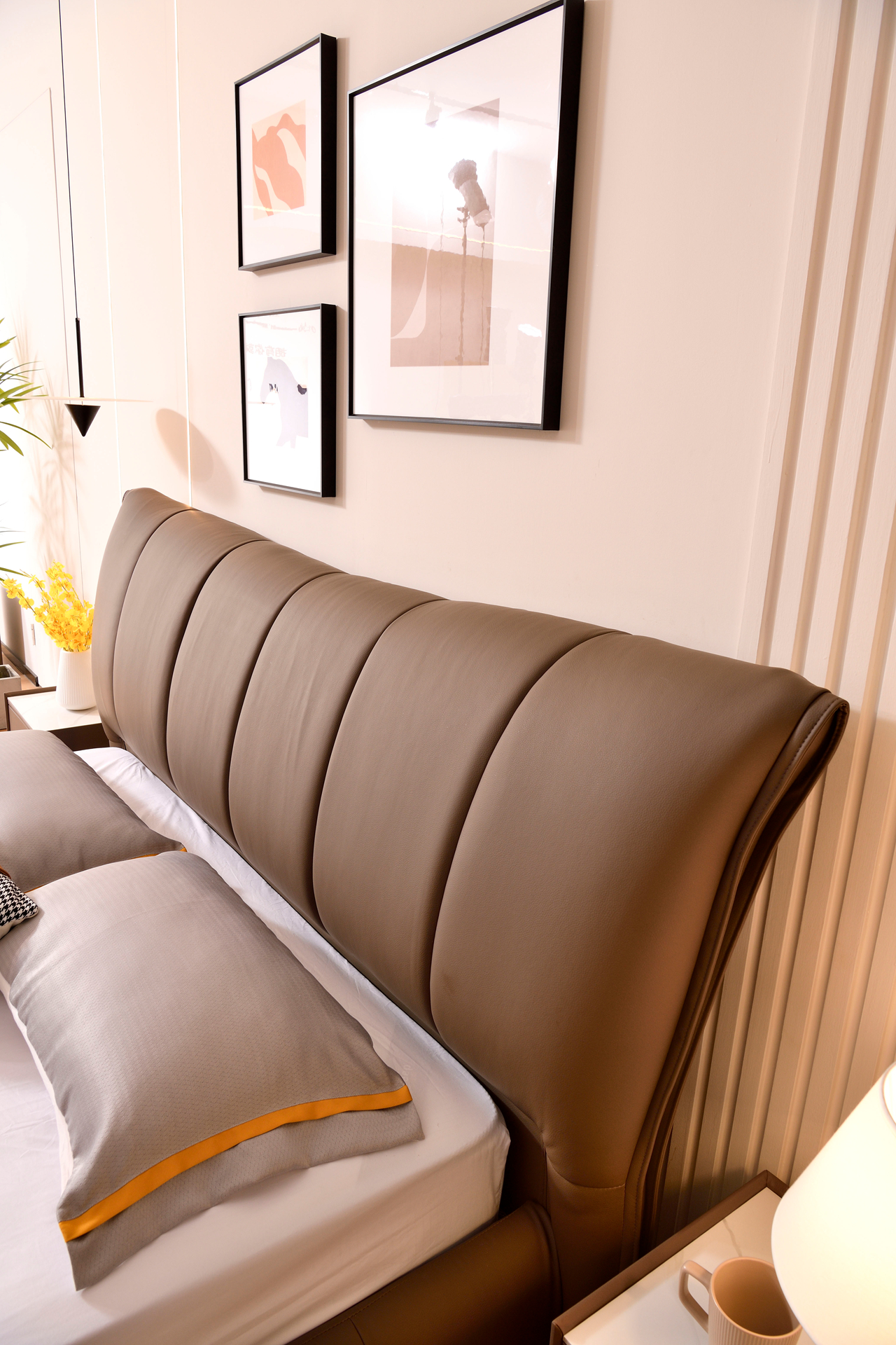 型号:A9012颜色:摩卡棕色面料:天骄真皮-15配置:内嵌式沉边设计,沙发脚 30*150mm松木床板 30*150mm松木龙骨两根外围尺寸1.5M: 2000*1200*2350mm1.8M: 2300*1200*2350mm