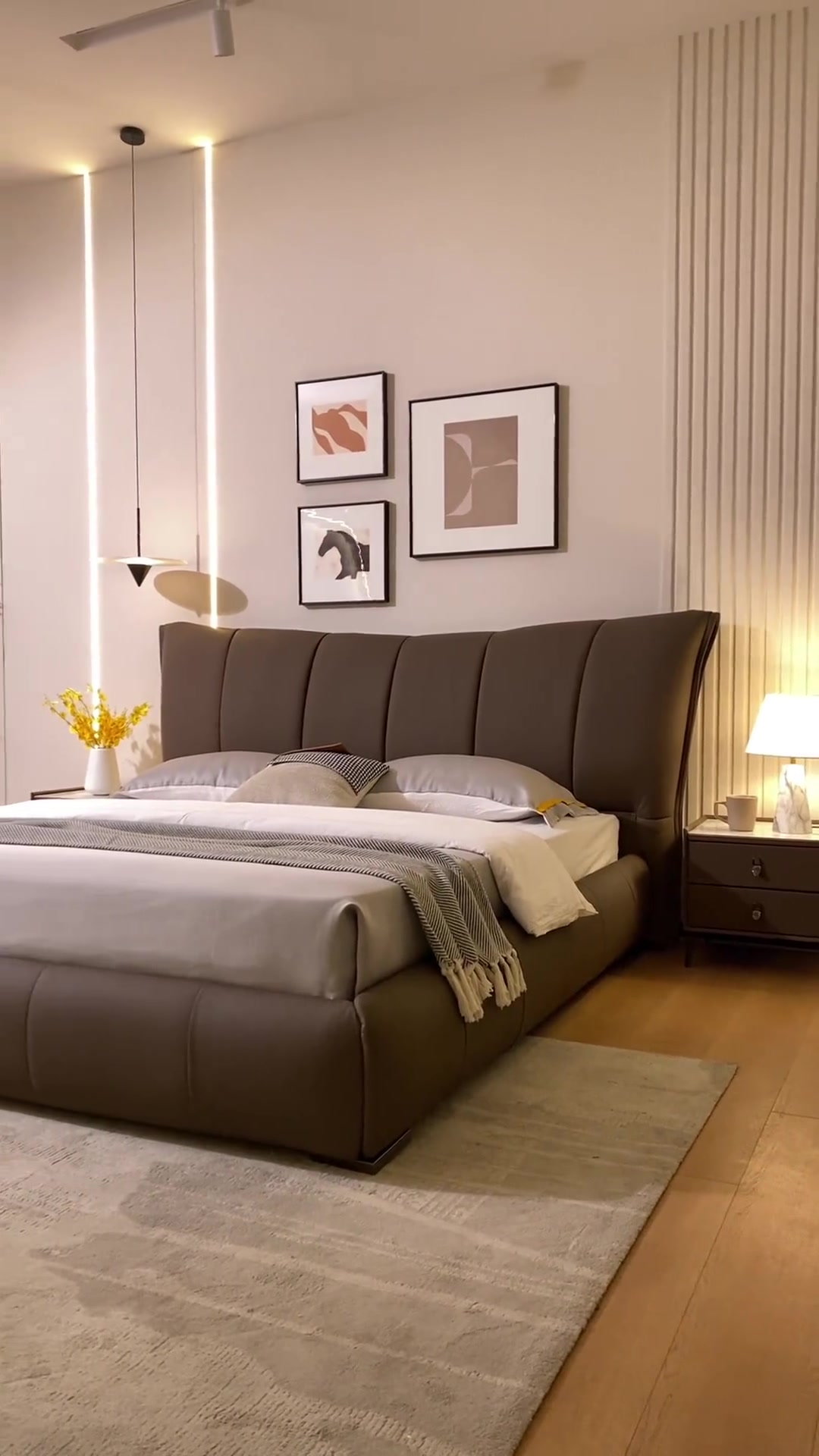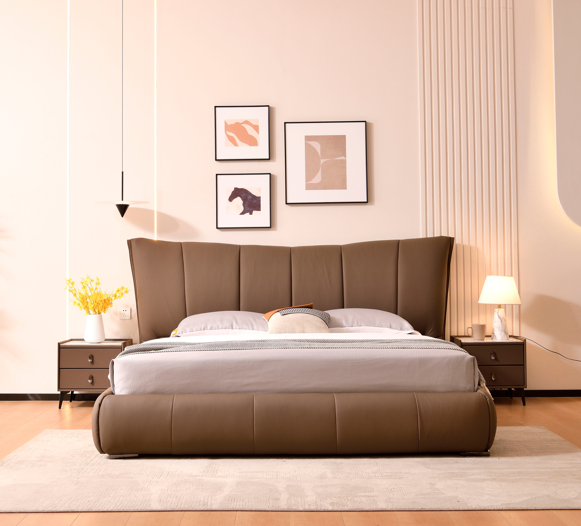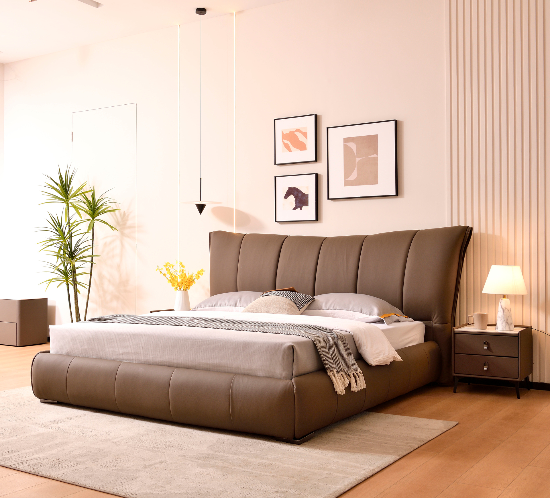 型号:A9012颜色:摩卡棕色面料:天骄真皮-15配置:内嵌式沉边设计,沙发脚 30*150mm松木床板 30*150mm松木龙骨两根外围尺寸1.5M: 2000*1200*2350mm1.8M: 2300*1200*2350mm