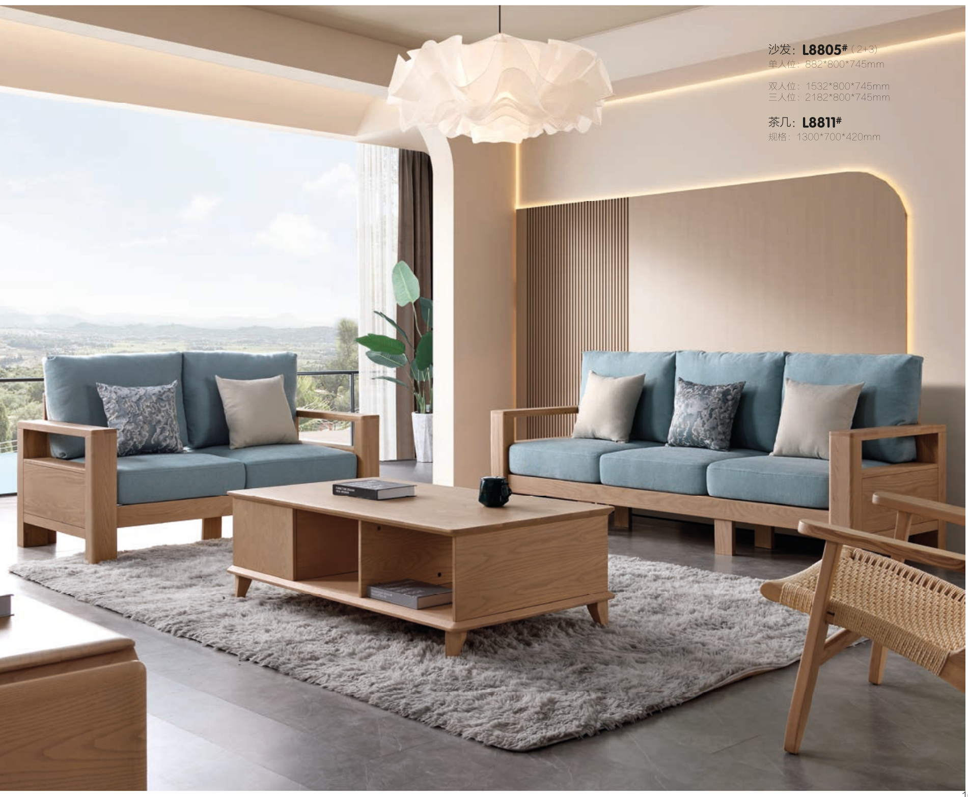 型号:L8805沙发材质:白蜡木L8805沙发规格:单人位:882*800*745mm二人位:1532*800*745mm三人位:2182*800*745mm4人位+脚踏:2932*1800*745mmL8812长茶几:1300*720*420mmL8812方角几:600*600*500mmL8821电视柜:主柜:1800*400*430mm伸缩柜:520*350*550mm(单个)