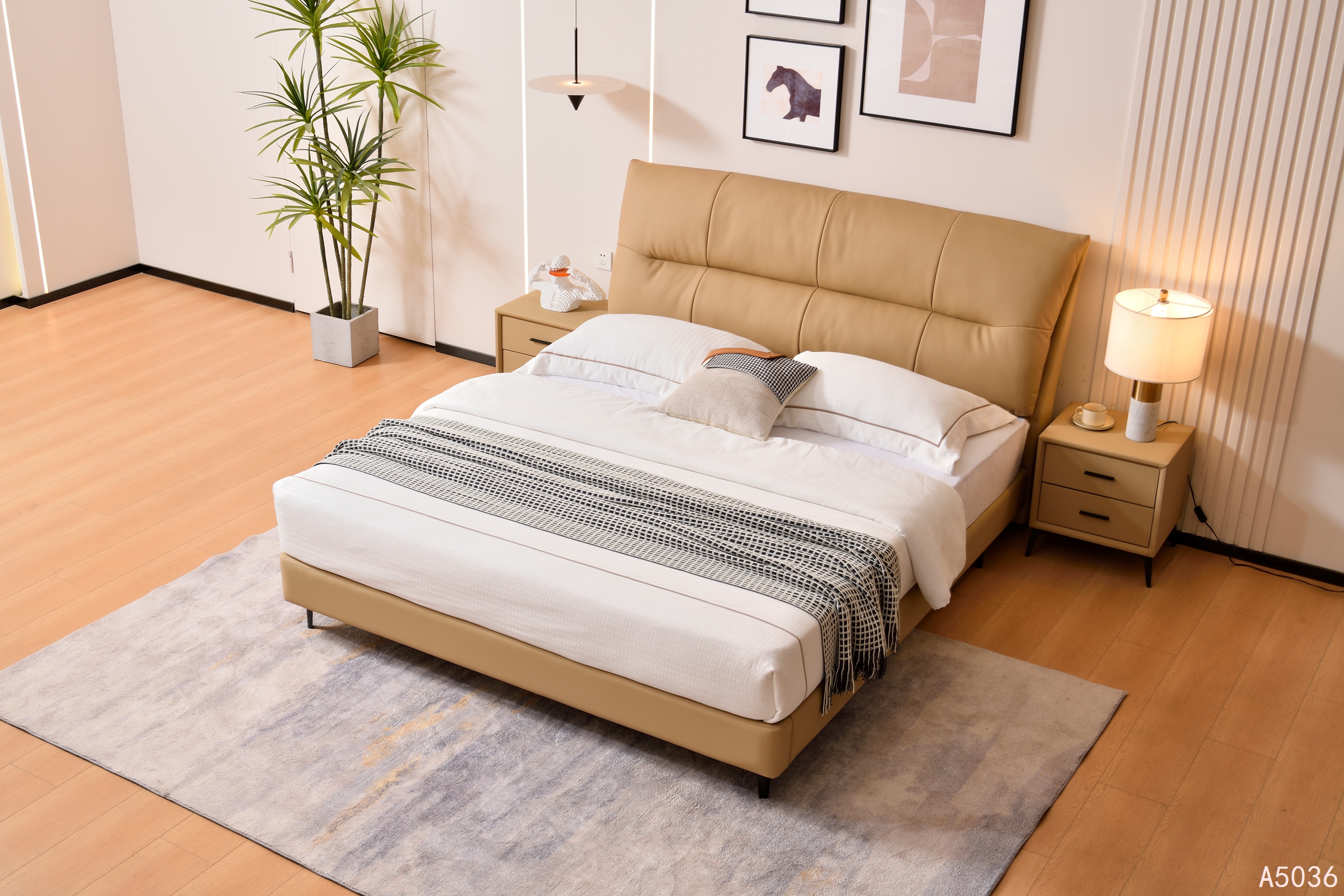 型号:A5036颜色:月黄色面料:生态真皮配置:80*150mm盒子床边 40*90mm松木龙骨 20*150mm松木床板 纸箱:K636C外径尺寸:1.5M: 1625*2300*1135mm1.8M: 1925*2300*1135mm