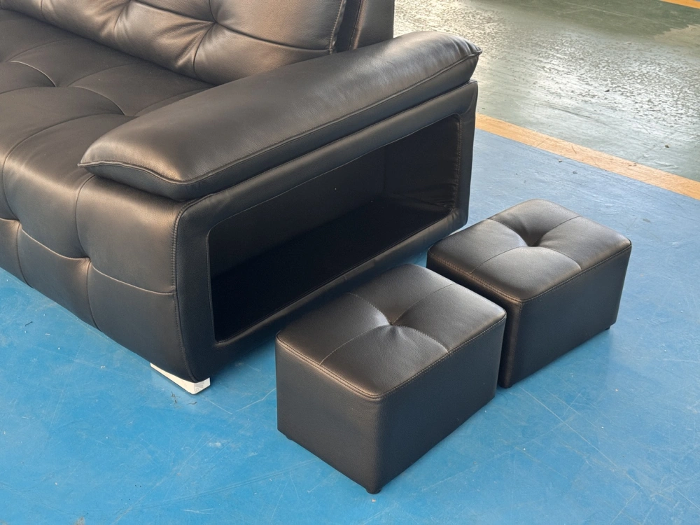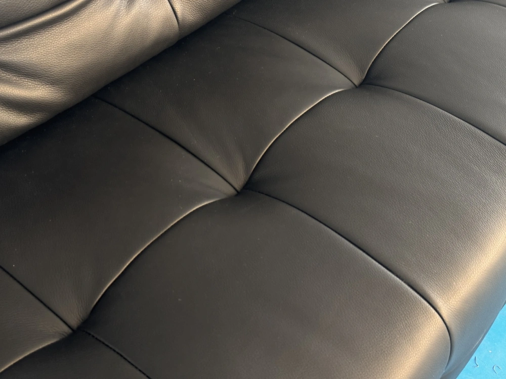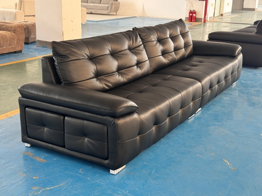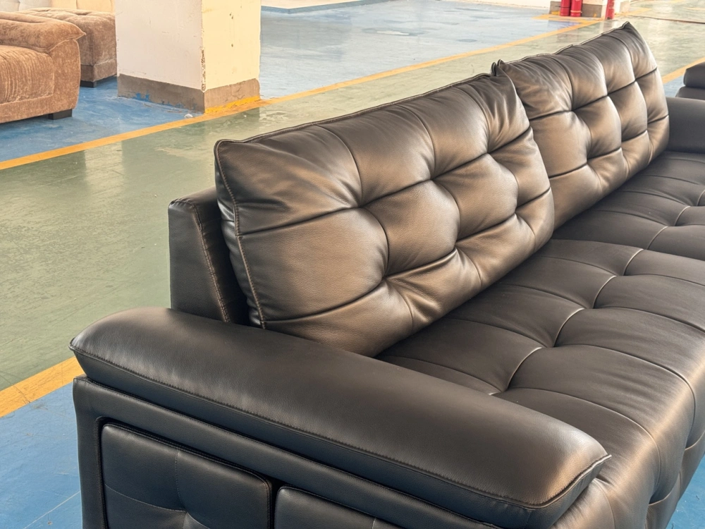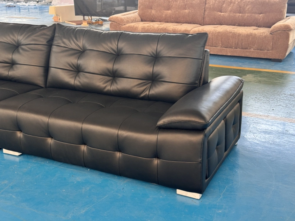 材质:生态真皮,3*10落叶松框架+4.0线径高锰钢蛇形镀金弹簧,13cm三层国标35kg/立方米密度海绵,背靠扶手3D丝绵填充。